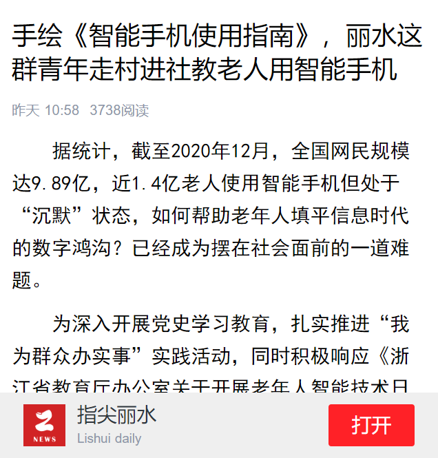 8月1日,指尖丽水报道了我校学生手绘《智能手机使用指南》,走村进社教老人使用智能机的消息。