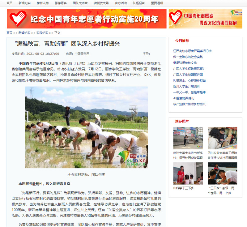 8月3日,中国青年网刊发了我校“满畦秧苗,青助浙丽”暑期社会实践团队深入莲都区魏村、松阳县官岭村进行助推乡村振兴的内容。