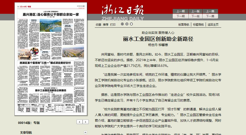 8月12日,浙江日报刊发了我校助推企业发展,与丽水工业园区合作推出的“走进企业”校外实践活动的消息。