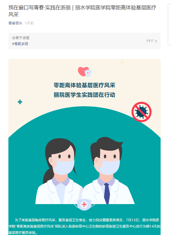 8月13日,丽水团市委官方微信号“青春丽水”报道了我校医学院“零距离体验基层医疗风采”暑期社会实践开展的情况。