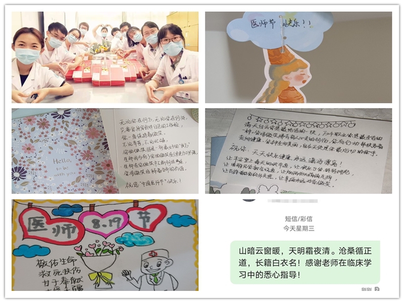 今年暑期,医学院“零距离体验基层医疗风采”社会实践团队212名基层定向生深入丽水九县市、温州、舟山等16个地区,40个乡镇基层医疗卫生单位机构开展了为期2周的暑期社会实践。值此第四个“中国医师节”到来之际,为表达对医务工作者的崇高敬意,同时感谢他们在社会实践期间给予的辛勤指导,实践队同学们纷纷通过向医院带教老师赠送贺卡、明信片、发送祝福短信等方式送上最真挚的谢意。