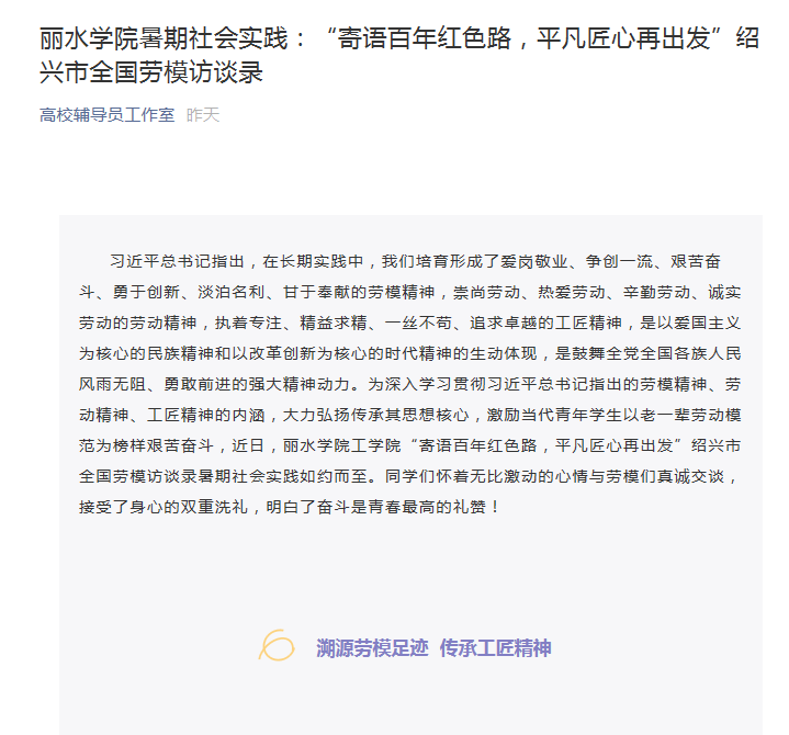 8月22日,高校辅导员工作室微信公众号报道了我校工学院“寄语百年红色路,平凡匠心再出发”绍兴市全国劳模访谈录的开展情况。