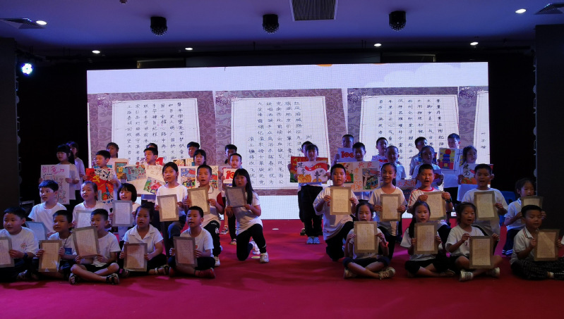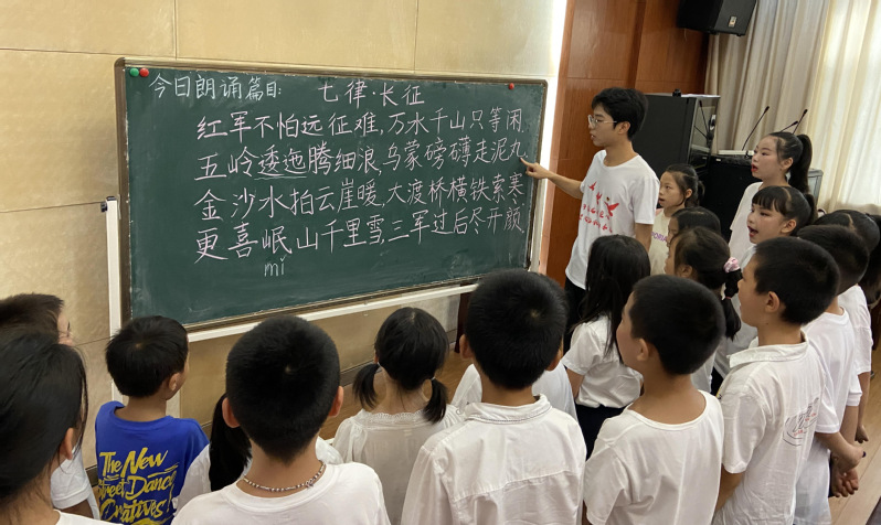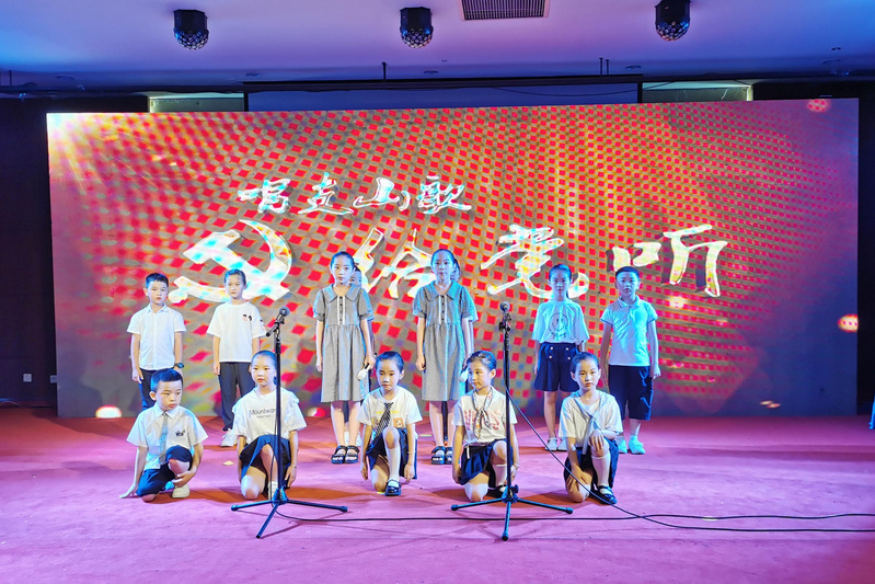 在龙泉市文化馆,同学们开展了为期半个月的暑期少儿艺术特长公益培训班义教,把党史学习教育融入义教活动,通过经典朗诵、学唱红歌、书法绘画传承红色基因,滋养儿童心灵。义教结束之际,同学们与孩子们一起举办成果汇报演出,载歌载舞颂党恩,现场座无虚席,气氛热烈。
