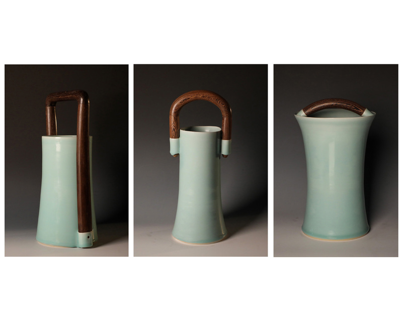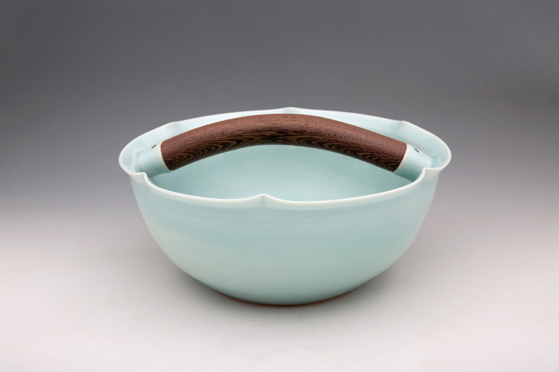 作品灵感来自于古代的提盒,以传统陶瓷器型和工艺为蓝本,不囿于旧习,凭借巧用材料和精湛技艺改变传统陶瓷器皿模式化的造型,演绎出融古出新的形态。其作品在造型上,关注两种不同材料的对话,自然古朴的木头纹理与素雅细腻的陶瓷语言相得益彰,产生特殊的视觉效果和装饰风格,给人返璞归真的亲切感。作品凸显了当代陶瓷器皿如何面对传统的态度,体现了传统与创新的学术指向。