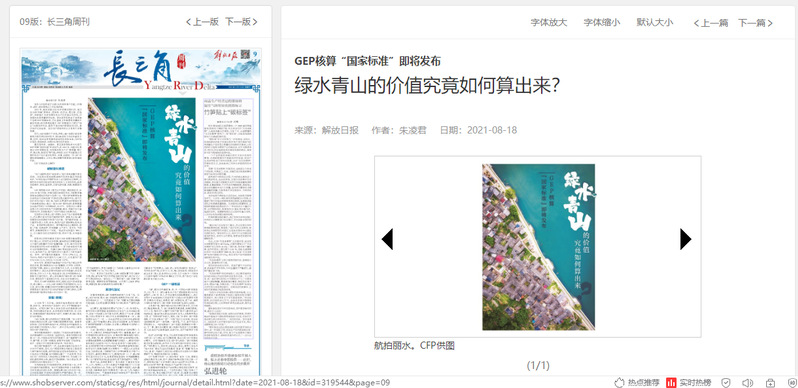 8月18日,解放日报刊发了我校两山学院在多地开展了GEP核算,探索绿水青山的价值的消息。