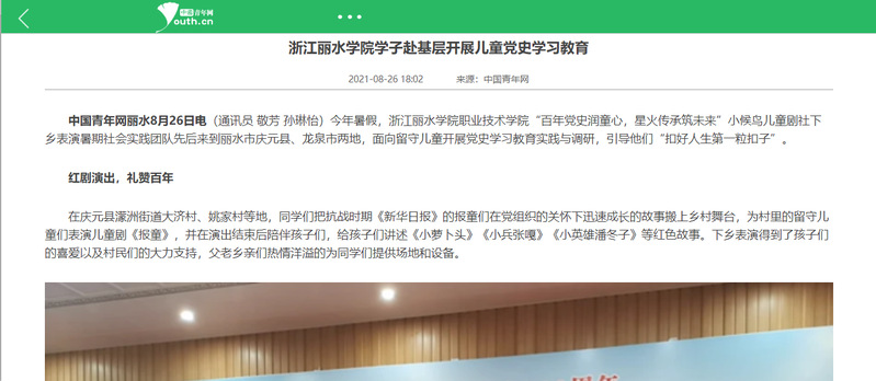 8月26日,中国青年网刊发了我校学子赴基层开展儿童党史学习教育的消息。