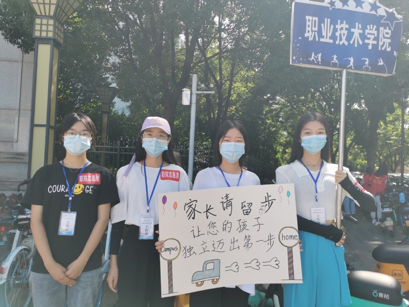 开学报到迎新的大门口,职业技术学院的志愿者捧着“家长请留步,让您的孩子独立迈出第一步”的海报,从家长手中接过行李,带着新生走进校门。