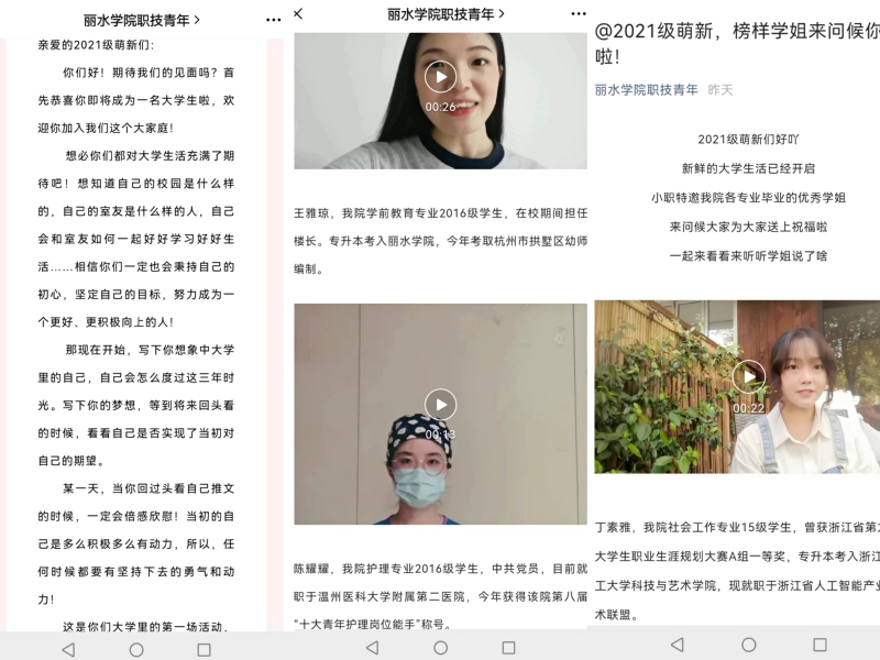 新生报到前夕,职业技术学院在线上面向新生举办“大学里的第一场活动”——“我的大学,我的梦想”主题新生征文大赛,得到了新生的积极响应和踊跃参与。同学们尽情描绘蓝图、畅谈理想,有的立志要专升本,有的立志要参军报国。在职业技术学院新生报到现场,优秀学子光荣榜吸引了新生们驻足欣赏,同时,“丽水学院职技青年”公众号于开学第一天推送该院优秀毕业生对2021级新生的问候与祝福小视频,以榜样的力量引领新生学风建设,吸引了新生的广泛关注。