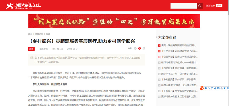 8月31日,中国大学生在线报道了我校医学院“零距离体验基层医疗风采”团队暑期社会实践的情况。