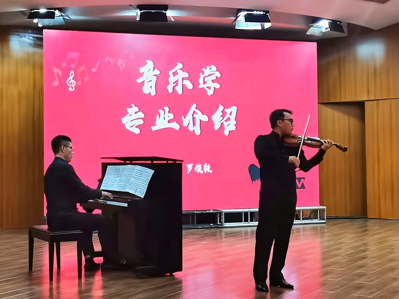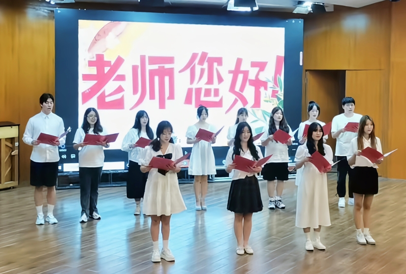 音乐系朴俊杰、华巍两位博士现场为新生演绎了一曲钢琴与小提琴联奏,不同器乐灵动组合的精彩联奏,带领大家置身于美妙音乐的魅力海洋,用音乐带给同学们更深的专业理解。饮其流者怀其源,学其成时念吾师,恰逢第37个教师节,新生也用朗诵的形式,在“开学第一课”的尾声声情并茂地朗诵了《老师,您好》,送上了教师节祝福。“老师,您辛苦啦!”,浓浓尊师意,款款爱生情,全体大一新生充满感恩之情的声音响彻西区音乐厅,铿锵有力而又整齐划一。现场气氛热烈,掌声不断。