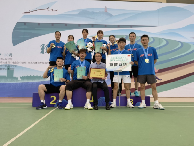 9月17日,丽水市第五届运动会(大众部)羽毛球赛在市体育莲花馆落幕。我校获宣教系统团体冠军,教师邢舟获男子双打冠军和混合双打冠军,潘宇峰获得优秀教练员称号。