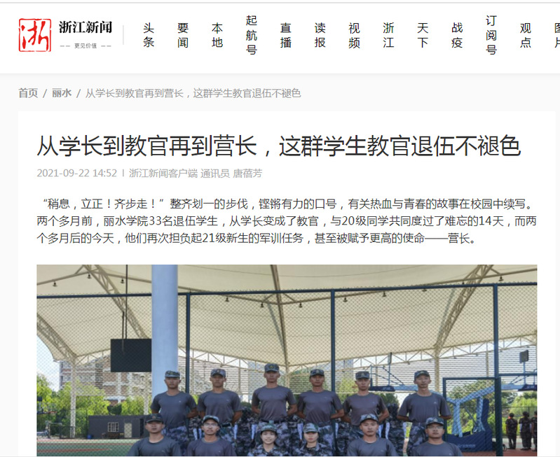 9月22日,浙江新闻刊发我校退伍学生再次担任新生军训教官的消息。