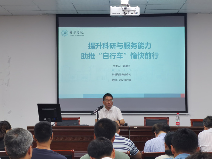培训会以王利琳书记提出的科研是“自行车的后轮驱动”形象比喻开讲,围绕科研与地方合作工作、科研相关政策、科研经费使用与学术不端行为防范、“1355”科研培育计划等四个方面进行讲解。