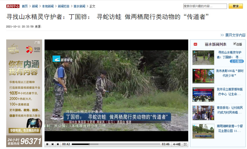 10月11日,丽水电视台新闻综合频道播出了我校丁国骅老师长期致力于两栖动物研究和保护的消息。