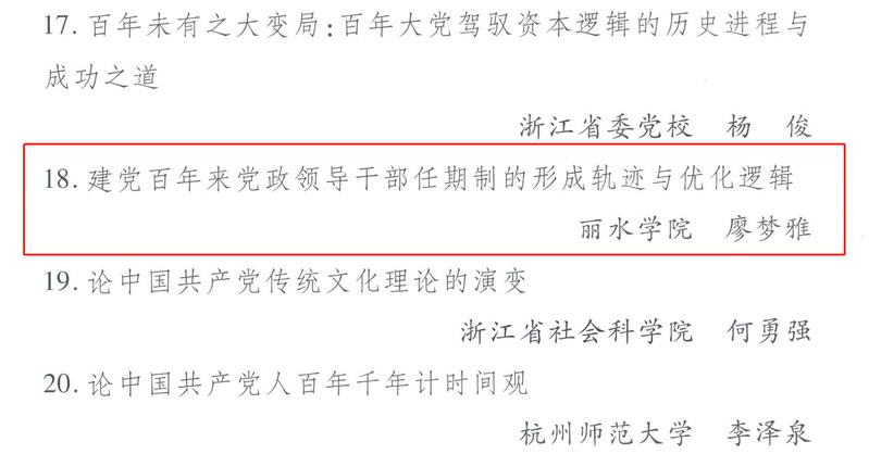 近日,由浙江省委宣传部、光明日报、嘉兴市委宣传部共同主办的“伟大建党精神理论研讨会暨2021红船论坛”在嘉兴南湖举行。我校马克思主义学院教师廖梦雅的论文《建党百年来党政领导干部任期制的形成轨迹与优化逻辑》成功入选由省委宣传部、省社科联编写的《浙江省庆祝中国共产党成立100周年论文集》。