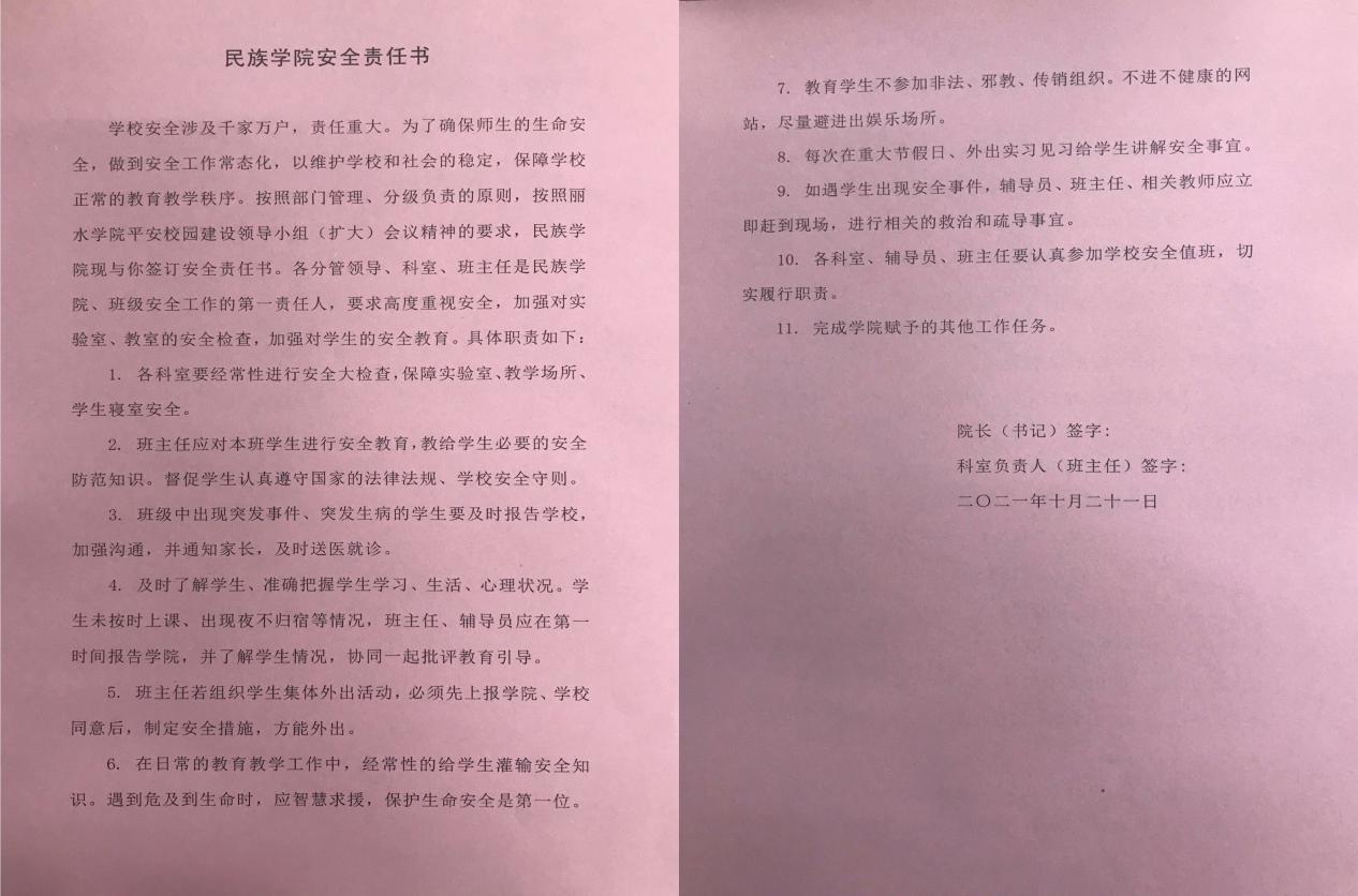 21日中午,该院召开10月份班主任例会暨安全工作会议,各系主任、学院安全工作领导小组成员一并参会,各科室负责人、班主任现场签订了《民族学院安全责任书》,明确安全任务,细化安全责任,层层分解落实,为平安校园建设保驾护航。