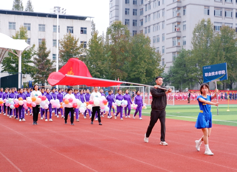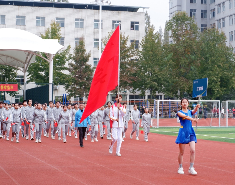开幕式上,国旗队、鼓乐队、彩旗队、裁判员代表队、各二级学院师生代表队以及机关、后勤、图信中心分工会代表队依次进入运动场。运动员代表和裁判员代表分别宣誓。