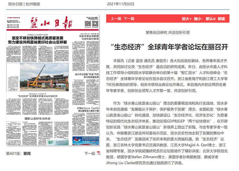 11月2日,丽水日报报道了我校召开“生态经济”全球青年学者论坛,共同探讨交流“生态经济”最前沿的研究成果的相关新闻。