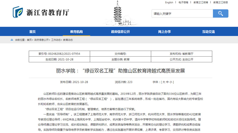 10月28日,浙江省教育厅网站发布了我校“绿谷双名工程”助推山区教育跨越式高质量发展的消息。