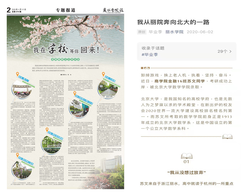 在新媒体类评比中,作品《我从丽院奔向北大的一路》(作者:卢奕亲 吴子沂 江忆婷 编辑:唐蓓芳)获新闻专题类一等奖;作品《丽水学院唱响原创歌曲致敬“防护服里的你”》(作者:夏伟涛等)获融合创新类三等奖。
