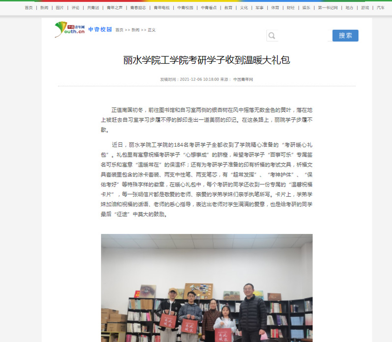 12月6日,中国青年网报道了我校工学院为考研送温暖活动的相关新闻。