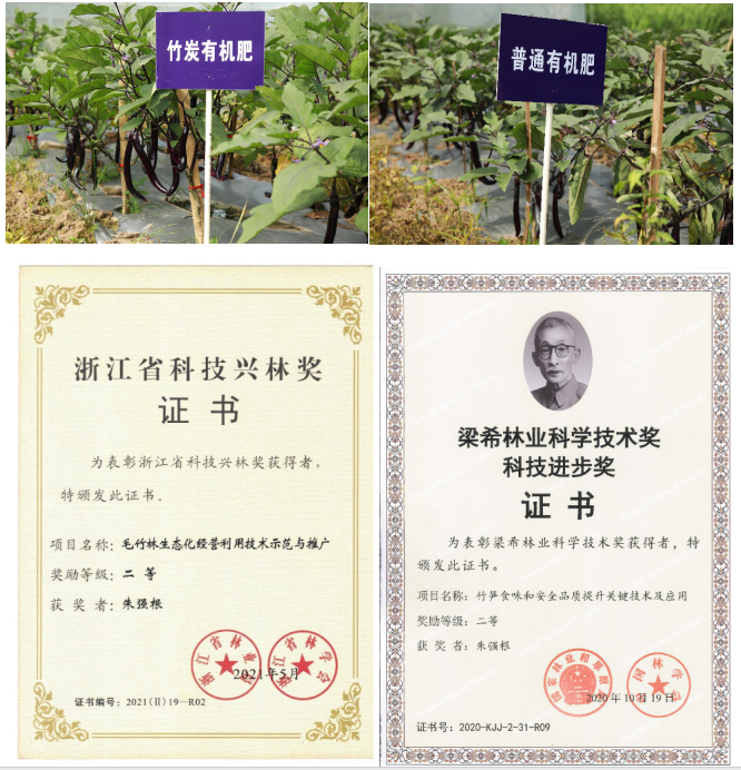 本成果基于竹子的木质素、纤维素碳链结构,在控温控压控时等条件下获得适合调理劣变土壤的炭基材料,辅以测土推荐的矿物养分和补充适量含特定微生物菌群的有机活性物质,研制完成竹炭基土壤调理剂,可以改变土壤碳结构、调节土壤pH值、改良土壤微生物菌群结构、提高作物抗枯萎病能力。团队在《Genomics》《Frontiers in Plant Science》等发表多篇论文,成果曾获全国商业科技进步奖一等奖、梁希林业科技奖二等奖、浙江省科技兴林奖二等奖等,已经在遂昌、松阳、临安开展辣椒、茄子、茶叶、竹林等土壤劣变改良应用示范,连作障碍土壤病害降低4.0级,茄子株高增加15%,产量提高18%。