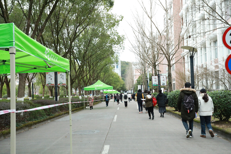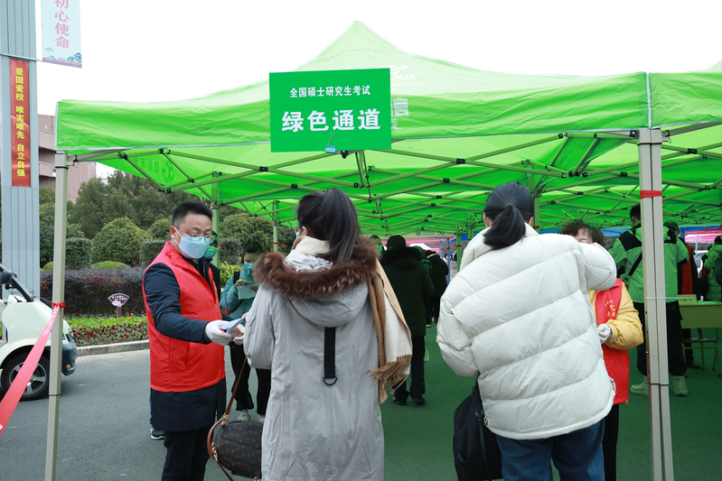 按照疫情防控要求,考生们佩戴好口罩,出示48小时内核酸检测阴性证明、行程码、健康码,测温、消毒后有序进入校园。此次研究生考试,学校共安排了133个考场,涉及八栋教学楼。所有考场在考试前一天晚上进行消杀、封闭,第二天使用后再进行消杀、封闭,如遇不同考生,还要定时消杀。此外,还设立了3个备用考场及1个隔离考场。