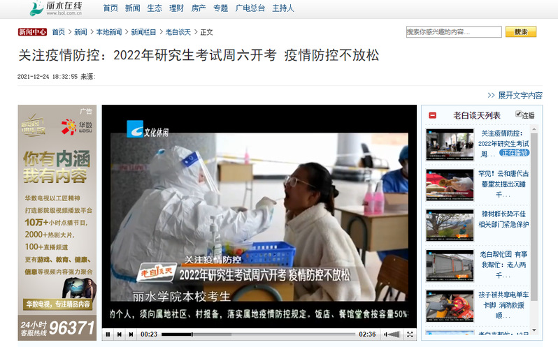12月24日,丽水电视台老白谈天栏目播出了我校为2022年研究生考试进行的准备工作。