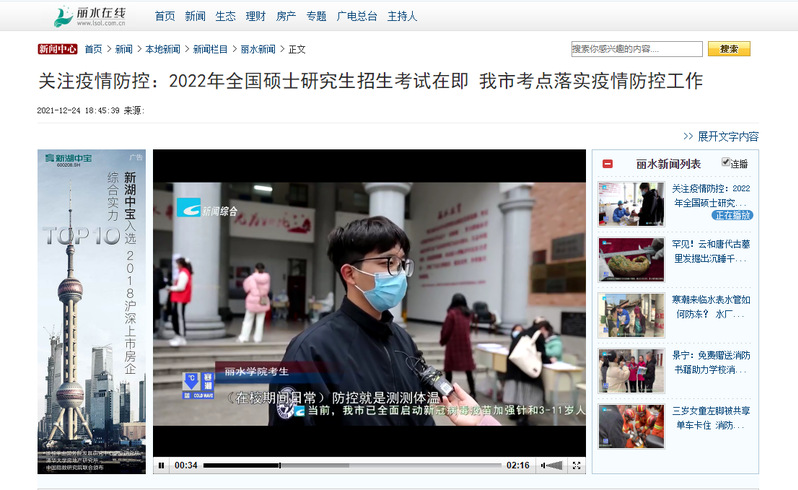 12月24日,丽水电视台新闻综合频道播出了我校作为2022年全国硕士研究生招生考试考点落实疫情防控工作的内容。