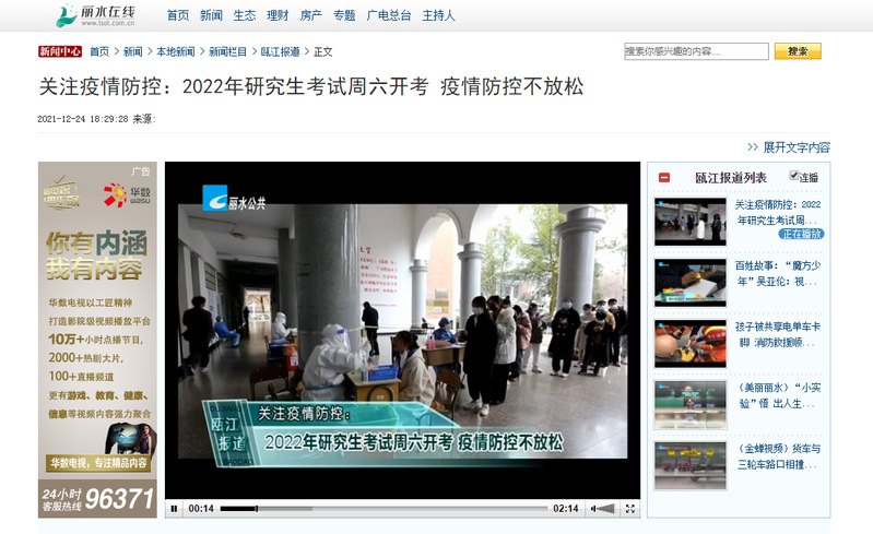 12月24日,丽水电视台瓯江报道栏目播出了我校作为硕士研究生考试考点,进行疫情防控工作的内容。