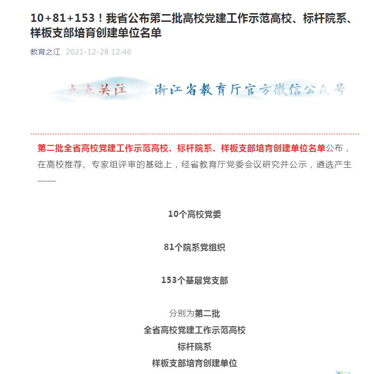 近日,浙江省教育厅党委公布了第二批全省高校党建工作示范高校、标杆院系、样板支部培育创建单位名单,我校民族学院党委入选全省高校“标杆院系”培育创建单位,医学院护理学系教师党支部、生态学院园林园艺系教师党支部入选全省高校“样板支部”培育创建单位。