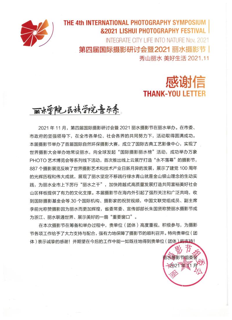 近日,我校收到了来自丽水市摄影节组委会的两封感谢信,信中表达了组委会对我校在摄影节期间积极参与和大力支持的感谢。
