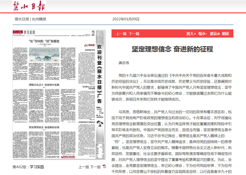 1月9日,丽水日报刊发了我校马克思主义学院龚志伟的理论文章《坚定理想信念 奋进新的征程》。