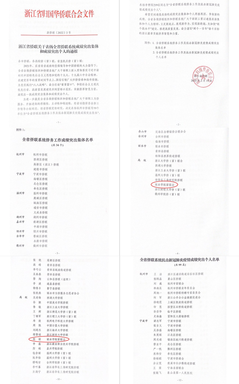 近日,浙江省侨联发文通报表扬全省侨联系统成绩突出集体和成绩突出个人。我校留联会被评为省侨务工作成绩突出集体(获此殊荣的全省高校共8个),留联会会长程丽被评为侨务工作成绩突出个人。