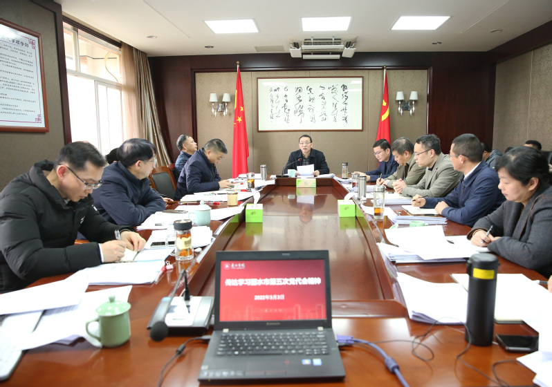 校党政班子成员李俊杰、郭献进、叶华松、蒋黎红、汪亚明、周一红、彭兵、余德华、王赳、廖峰出席。会议指出,丽水市第五次党代会高举中国特色社会主义伟大旗帜,以习近平新时代中国特色社会主义思想为指导,系统总结了过去五年的工作,深刻分析了丽水新阶段的发展特征和发展任务,旗帜鲜明确立了“大力弘扬践行浙西南革命精神,坚毅笃行‘丽水之干’,永做跨越式高质量发展道路上奋勇向前的新时代‘挺进师’,为全面建设绿水青山与共同富裕相得益彰的社会主义现代化新丽水而不懈奋斗”的工作主题。