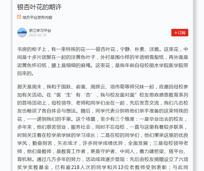 2月25日,学习强国浙江学习平台刊发了我校医学院校友张辉虎返校参与“医生有‘杏’,我与校友面对面”校友思政感恩教育系列活动的感想随笔。