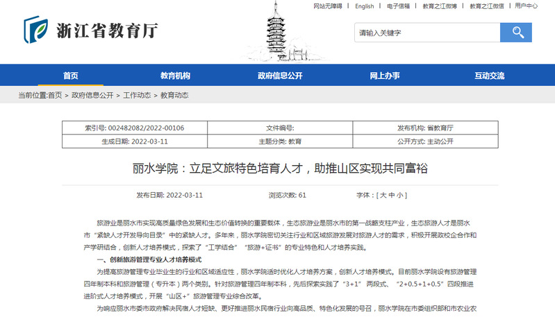 3月11日,浙江省教育厅网站刊发了我校《立足文旅特色培育人才,助推山区实现共同富裕》旅游管理专业发展纪实文章。
