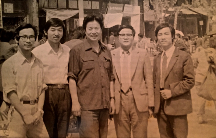 著名歌唱家李光羲(中),时任校团委书记的汪建云(右2),时任校学生会副主席徐迅雷(左1)邀请李光羲先生到丽水师专开设一场音乐讲座,这是在丽水街头的合影。