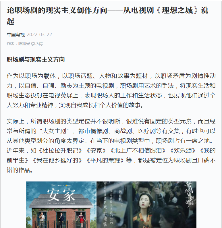 3月22日,学习强国中国电视平台刊发了我校特聘教授陈旭光、民族学院教师李永涛合作的评论文章《论职场剧的现实主义创作方向——从电视剧<理想之城>说起》。