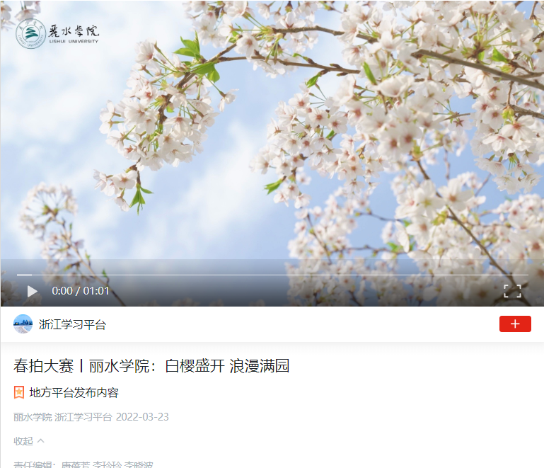 3月23日,学习强国浙江学习平台刊发了我校樱花园白樱盛开,郁金香竞相争艳的视频内容。