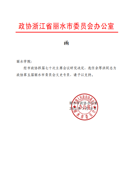 日前,政协浙江省丽水市委员会办公室发函致我校,经市政协四届七十次主席会议研究决定,选任我校余厚洪老师为政协第五届丽水市委员会文史专员。