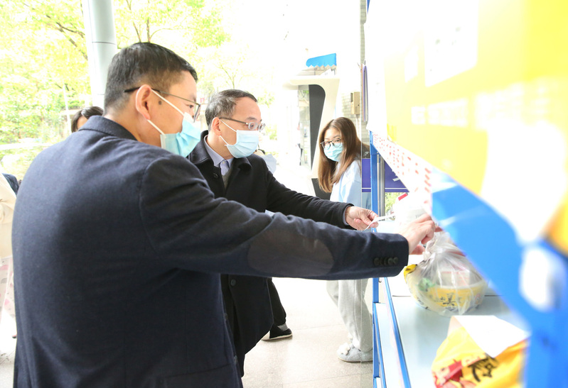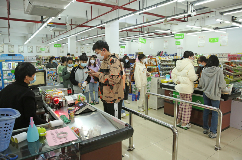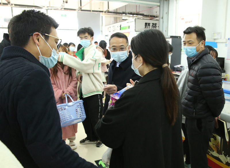在超市入口,“同学,你这个口罩戴得不规范”“同学,你买太多方便面了,得买点牛奶,注意补充营养……”校领导的一声声叮嘱让前来购买零食的学生倍感温暖:“谢谢王书记、李校长的关心……”