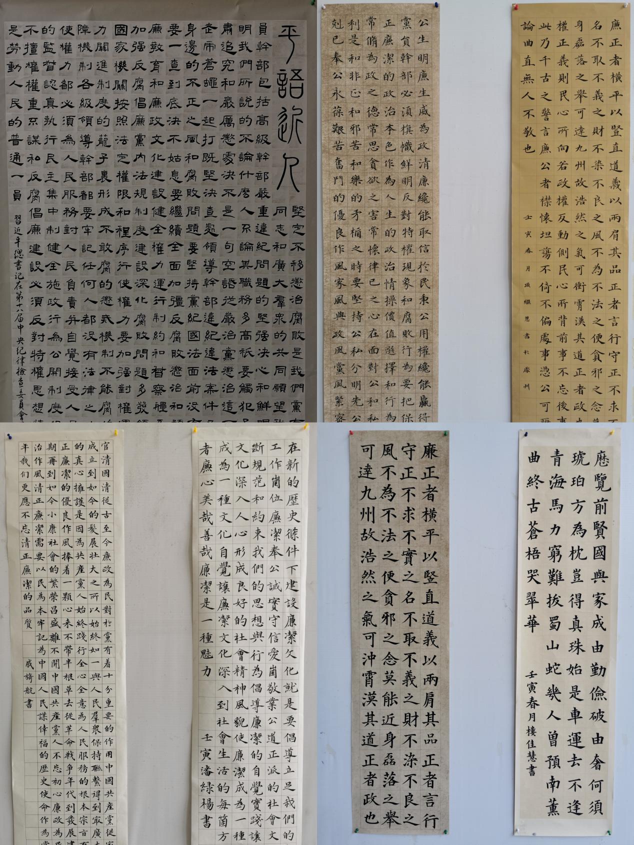 为全面推进党风廉政建设,积极倡导校园廉洁文化,献礼我校115周年校庆,近日,教师教育学院开展“新风廉韵,润心育人”主题书法大赛,将大赛获奖师生的作品面向全校展示,发挥师范专业特色,进一步坚定理想信念,促进全体党员干部增强纪律规矩意识,筑牢拒腐防变的思想防线。