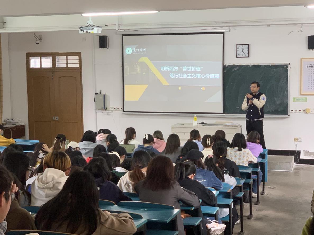 教育引导进课堂。学院分阶段为学生深入讲解社会主义核心价值观的内涵,帮助学生更好地掌握二十四个字的精神实质。通过最新的资讯、鲜活的案例故事,让学生直观地领会什么是道路自信、理论自信、文化自信、制度自信,更深刻地明白当代大学生的社会责任与时代担当。
