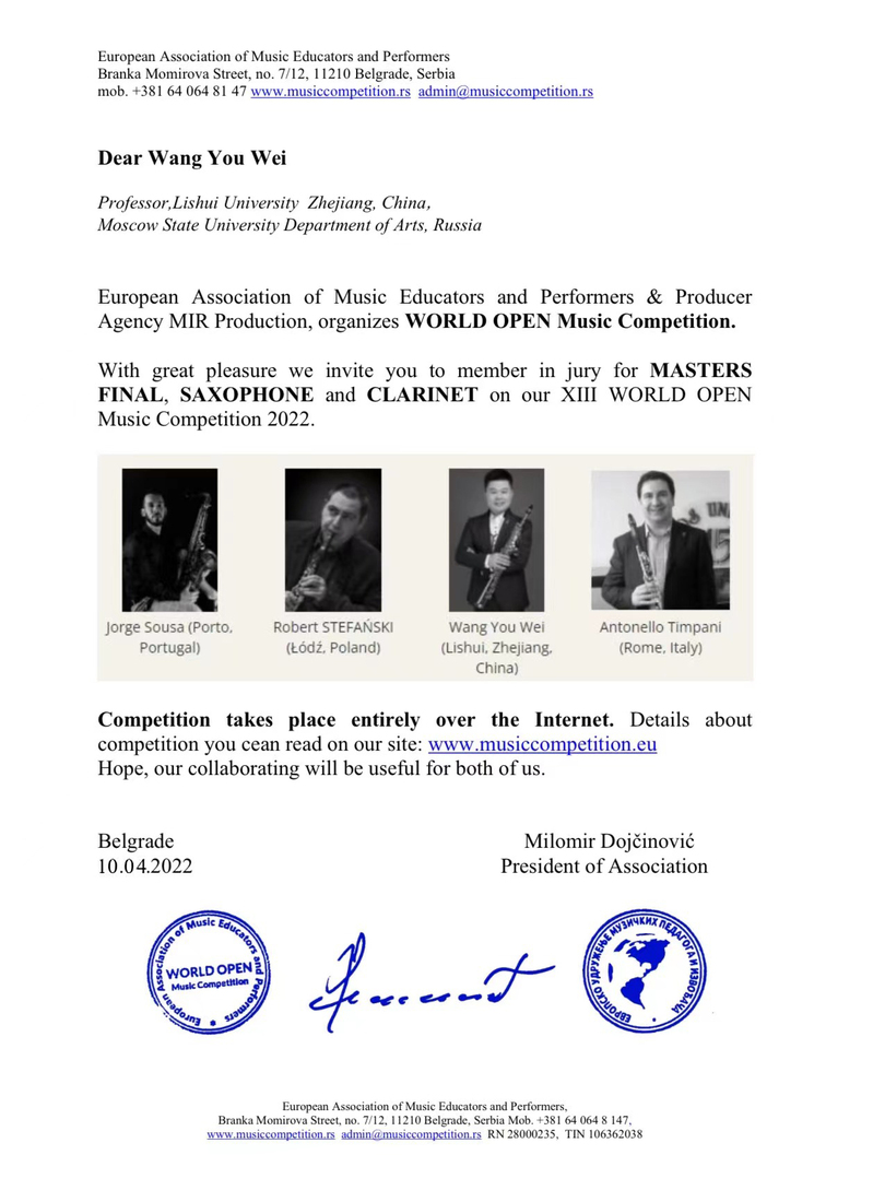 近日,我校教师王有为博士作为推动现代派音乐的国际萨克斯风演奏家,受邀担任由塞尔维亚国家文化部、欧洲音乐协会联盟和高等音乐院校教师协会共同主办,贝尔格莱德大学承办的第十三届国际音乐公开大赛评委。