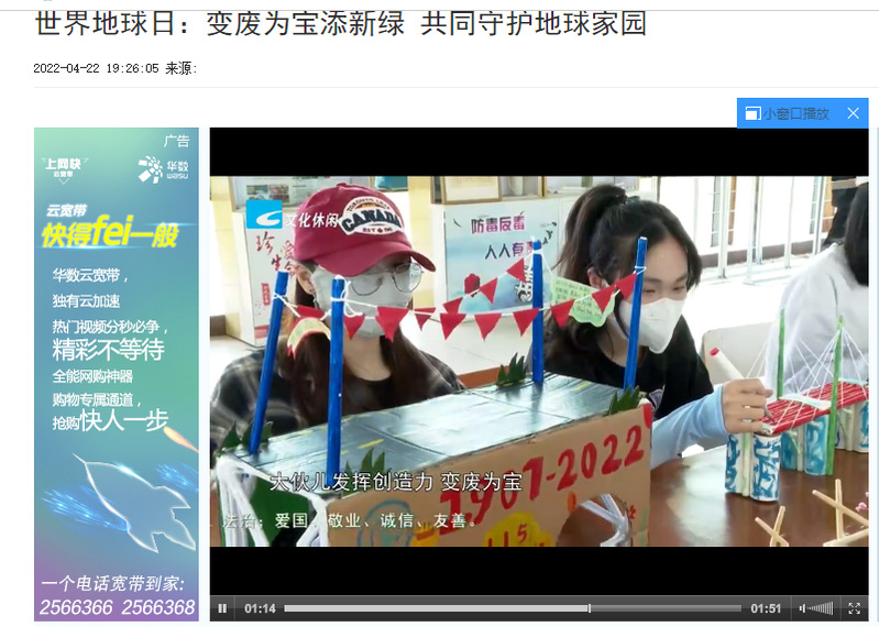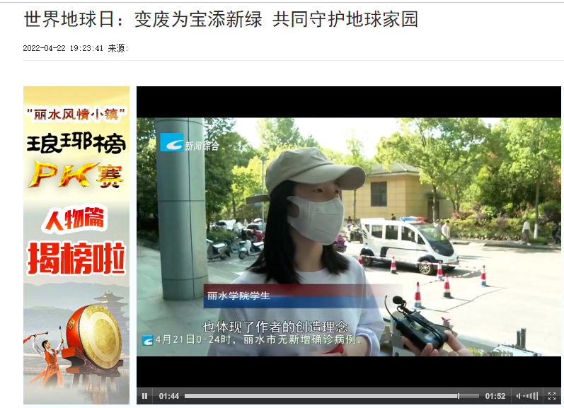 4月22日,丽水电视台新闻综合频道和文化休闲频道报道了我校学生变废为宝制作生态模型,呼吁保护地球家园的消息。