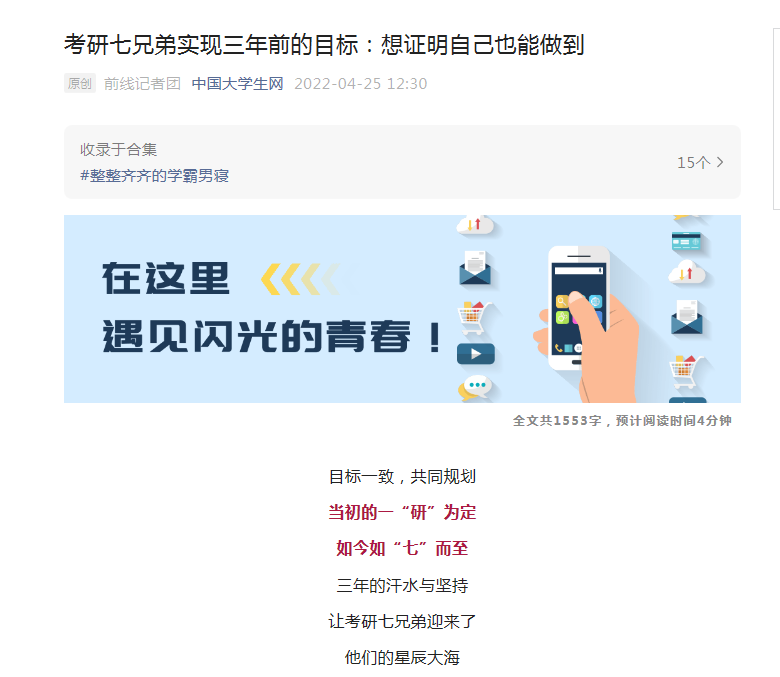 4月25日,中国大学生网微信公众号发了我校工学院考研团7人全部上岸的消息。