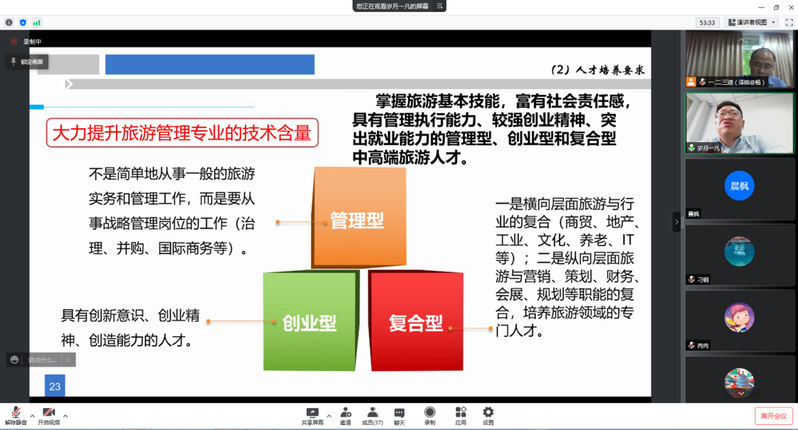 易开刚教授从疫情之下的旅游消费和国家文旅部“十四五”规划中的旅游定位切入,围绕旅游产业发展新趋势、旅游人才培养新理念两方面展开,做了一场专业性、指导性强,内容丰富、深入浅出的学术报告。报告中提到的旅游产业整体大环境、国家旅游产业发展目标定位、旅游发展新时代、旅游产业人才队伍新需求、创新型旅游人才培养计划、旅游专业TRAVEL培养新模式等,向师生呈现了旅游管理专业发展的新前景。