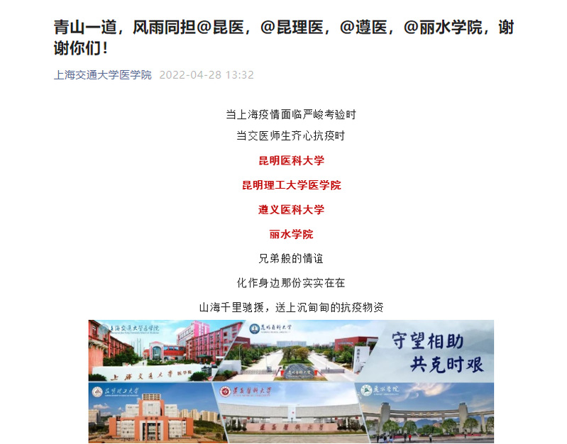 上海交通大学是帮扶我校的高水平高校,双方合作已多年。近期由于疫情原因,上海物资相对紧缺。为支援抗疫,4月27日,我校紧急筹集了17吨生活物资,连夜运往上海交通大学医学院及上海交大医学院附属第九人民医院。28日凌晨,专车顺利抵达上海,上海交大医学院及其附属九院及时收到了我校的援助物资。此次援助活动充分体现了我校与上海交大医学院山海守望,沪丽相助,共克时艰的情意。