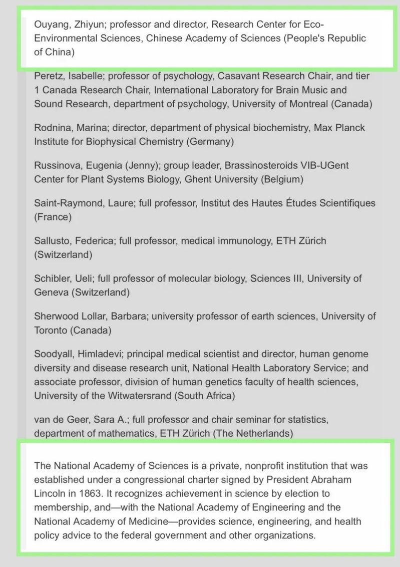 美国(国家)科学院(National Academy of Sciences,NAS)成立于1863年,由时任美国总统林肯授权创建,是一家由科学家和工程师组成的私立机构,致力于为美国联邦政府提供科学技术方面的咨询和建议。当选为美国科学院院士(NAS Member)是美国学术界最高荣誉之一,当选者均是在科技和工程方面取得杰出成就的科学家和工程师。截止2022年5月3日,美国科学院有院士2512名、外籍院士517名,其中约200位院士是诺贝尔奖获得者。